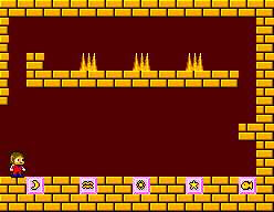 The lake isn't much a level as it is a playable epilogue. By diving down into the very short underwater area the player will reach a room with a door, where Alex Kidd will insert the Sun Stone Medallion and Moonlight Stone Medallion. On the room inside the player must solve the puzzle to reveal the Gold Crown, stepping on the symbols in the ground in the correct order given by the Hirotta Stone. Once the player picks the Gold Crown, the player will beat the game.