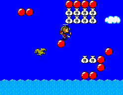 The second area is the first Peticopter level in the game. Various money bags are scattered in this area, along with red bricks and a few enemies. If Alex loses the Peticopter, he will fall in the lake area below.