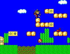 Right at the beginning of the level is a shop where the player can buy a Peticopter. This is entirely optional, as the level can still be played without it, though it is definitely helpful as it allows the player to reach the various money bags and avoid most enemies. After helping the village, the Village Elder informs Alex that his elder brother, Igul, is imprisoned in the Radaxian Castle.